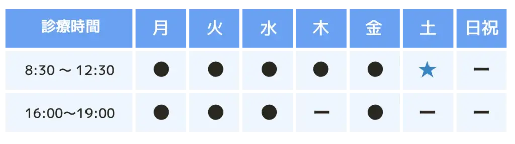| 診療時間 | 月 | 火 | 水 | 木 | 金 | 土 | 日祝 |